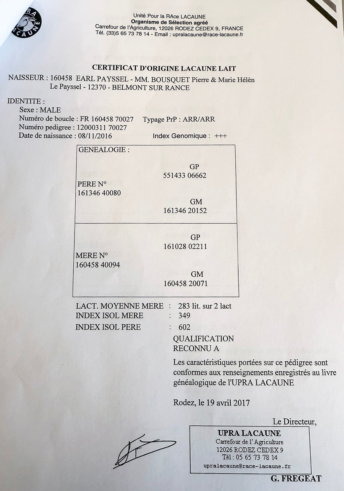 Description: "The UPRA Lacaune rams were imported several years ago into the UK direct from France for use within the famous “Errington Cheese” milking sheep flock. The Erringtons are famous internationally and within the UK for producing numerous quality sheep and goat dairy cheeses in southern Scotland. The original and famous “Lanark Blue” is made from their unpasteurized ewe’s milk from their own flock of Lacaune ewes. These rams were used exclusively within their flock for several years, resulting in their offspring having improved yield and solids produced, improved udder conformation and milking ability both within their daughters and now their granddaughters’ generations. It is fair to say that their use within the Errington flock has been a great success and this is a rare opportunity to get such outstanding quality proven genetics for export to North America."